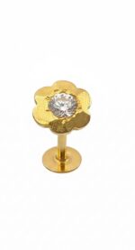 A feminine and delightful gold nose pin featuring a sparkling solitaire stone framed by a gold flower or petal design. A secure and stylish stud for everyday elegance.