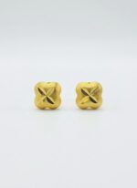 The main body of the stud, which forms the quadrant or lucky clover shape, is finished with a rich matte or brushed texture. This softens the look and enhances the deep golden color. The center of the earring features a crisp, carved cross or ‘X’ pattern with a contrasting high-polish or deep-cut finish, creating a dramatic focal point that catches the light.