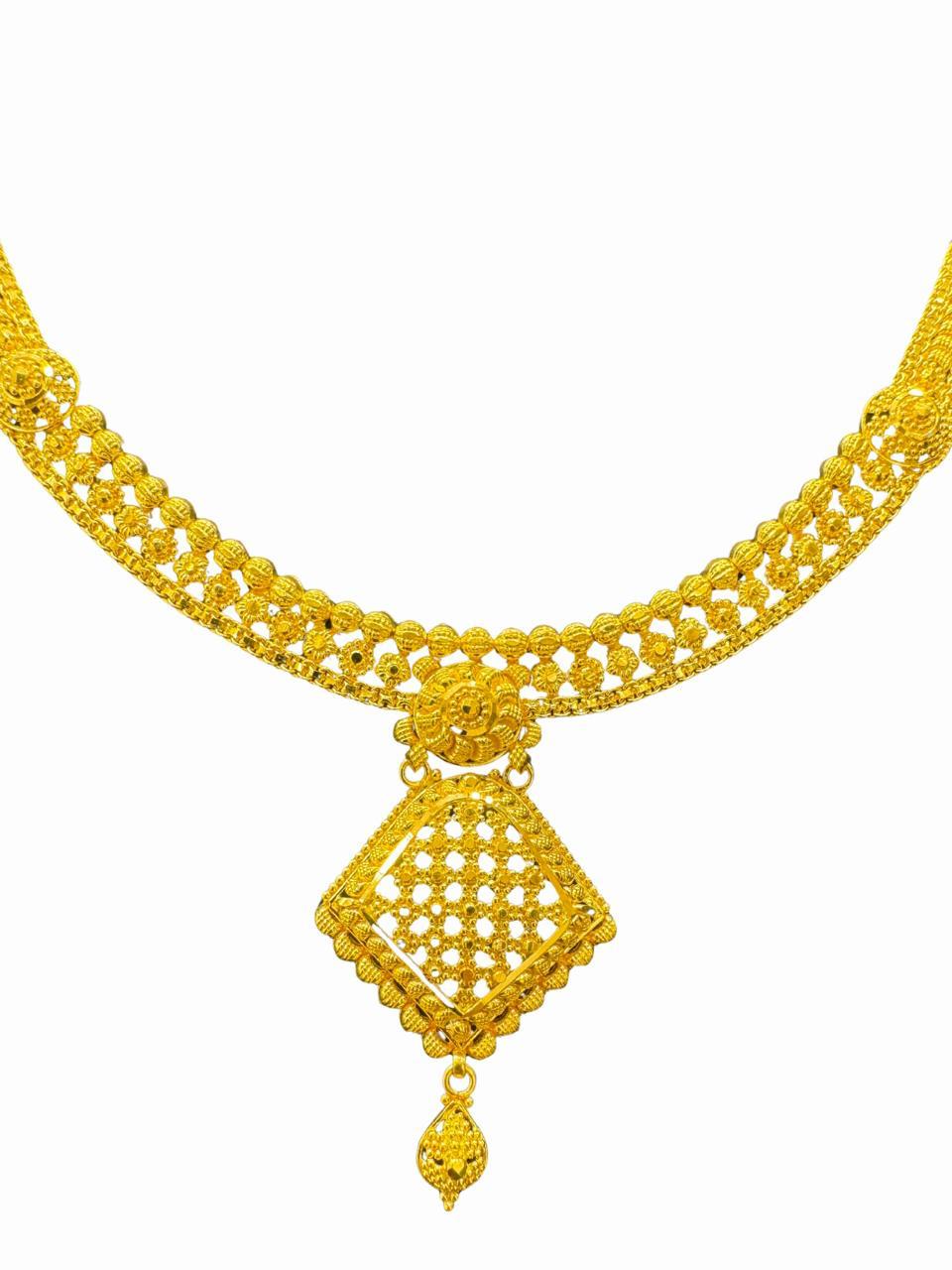 Step into timeless elegance with this exquisite 22K Gold Fan-Style Choker Necklace. Inspired by classic Indian motifs, the design evokes the majestic spread of a peacock’s tail (Mayur), making it a truly breathtaking piece of heritage jewelry.