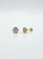 Chic geometric stud earrings featuring a brilliant seven-diamond cluster flower set within a polished yellow gold hexagon frame, perfect for everyday wear