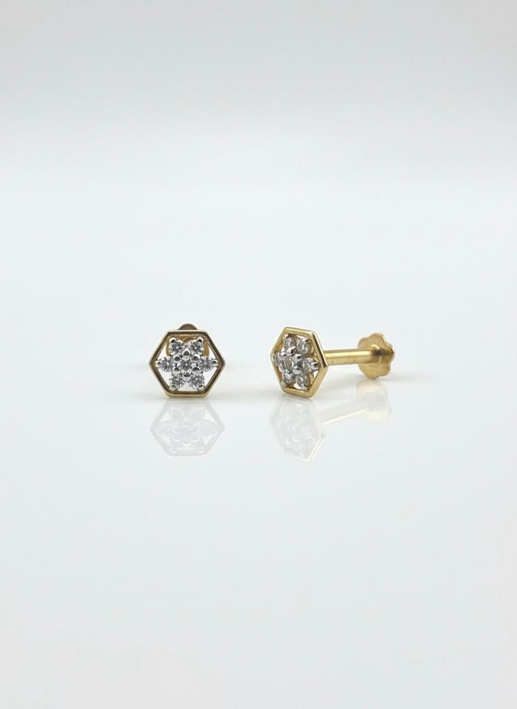 Elevate your daily style with these contemporary Diamond Hexagon Stud Earrings. Each earring features a sparkling central cluster of seven brilliant-cut diamonds, meticulously arranged to form a dazzling, six-petal floral or snowflake motif. This brilliant cluster is securely set in white gold to maximize its shine and is framed by a sleek, polished yellow gold hexagon. The combination of the classic diamond cluster and the modern geometric hexagon shape creates a unique, two-tone design that is both sophisticated and versatile. These easy-to-wear stud earrings are ideal for those seeking a modern piece with significant diamond sparkle.