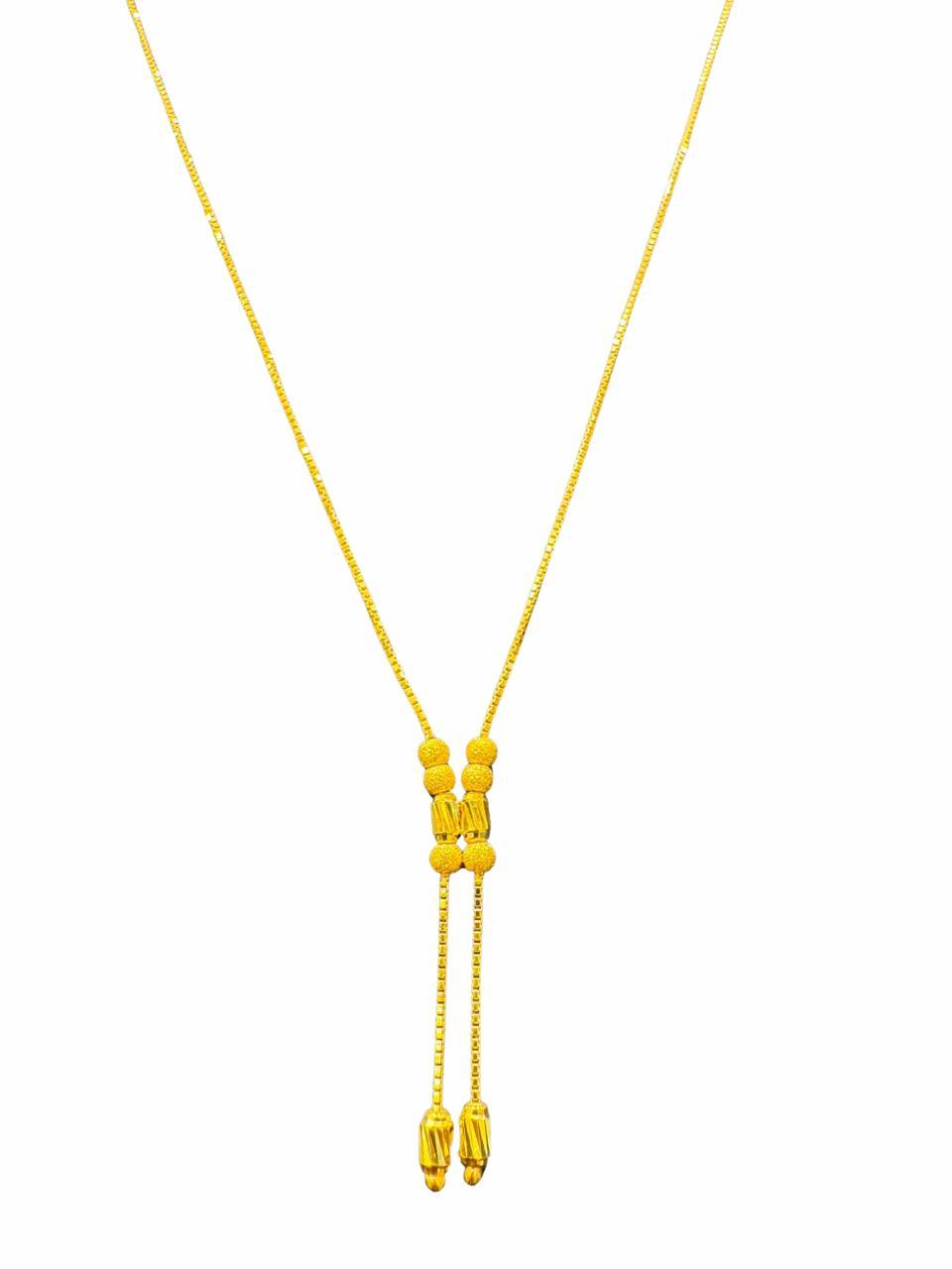 Introduce a touch of chic versatility to your collection with the Modern Gold Y-Drop Necklace. This contemporary piece is designed in a stylish bolo or lariat format, creating an elegant ‘Y’ shape that elongates the neck and complements deep necklines beautifully. The chain is a shimmering box-link style, which offers a sleek, modern texture. The centerpiece is a dynamic arrangement of textured gold beads—spherical beads with a sandblasted finish are paired with cylindrical beads featuring a ridged, polished surface. This unique arrangement allows the lower drops to slide, offering a degree of adjustable length. Finished with polished gold tassel-style drops, this necklace is the definition of understated modern glamour and is ideal for layering or wearing as a striking solo statement.