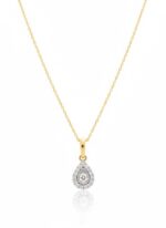 That is a beautiful diamond pendant! It features a classic Pear-Cut center stone surrounded by a diamond halo, all set in a two-tone design.