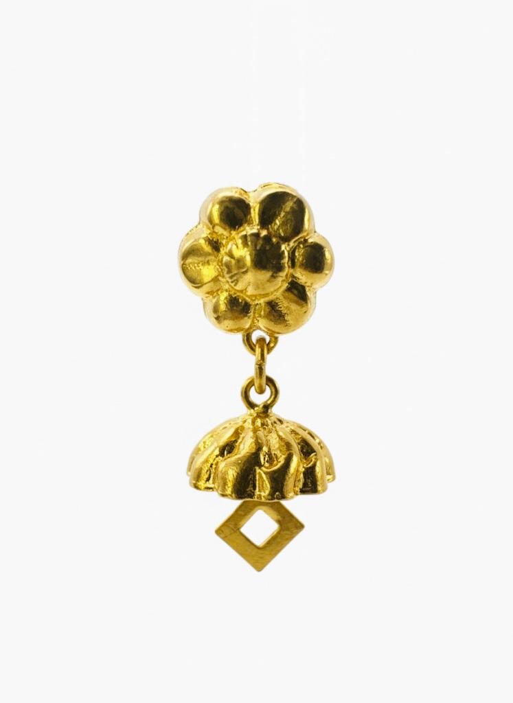 Traditional 22K yellow gold drop earrings featuring a flower stud and a small, delicate Jhumka (bell) drop with a diamond-cut accent. Perfect for festive wear.